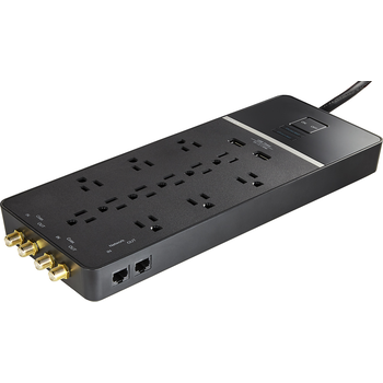 Plug electronic equipment into a single power source with this Rocketfish 12-outlet surge protector. It has two USB charging ports and two coaxial cable connections to support additional electronics. This Rocketfish 12-outlet surge protector has a 6-foot cord with a right-angle plug so you can customize the placement of equipment easily.